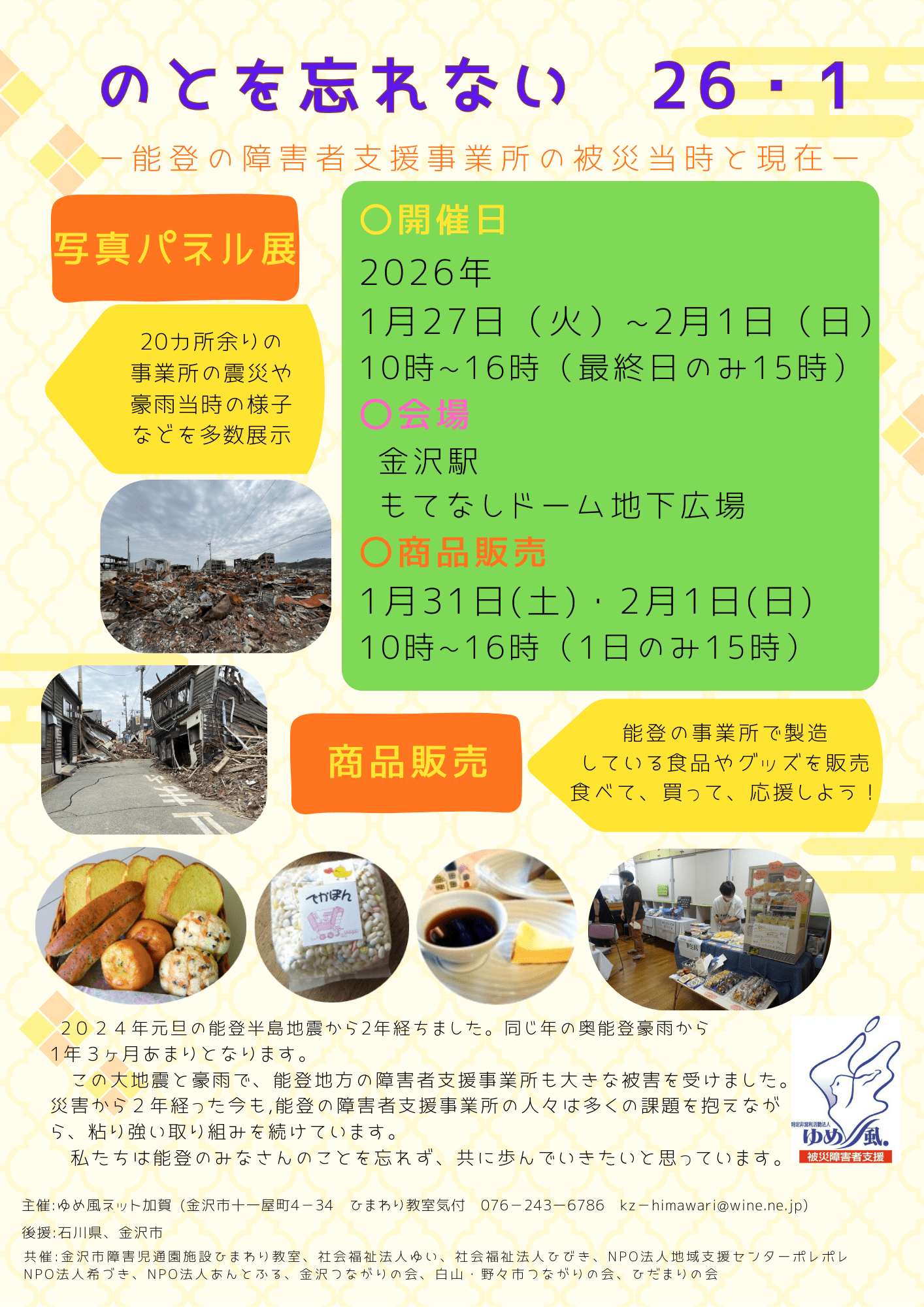 能登半島地震から2年を迎え、能登の障害者支援事業所の被災当時と現在の様子を伝えるため、写真パネル展を開催します。1/31,2/1の土日には、能登の事業所で製造している食品や雑貨も販売します。